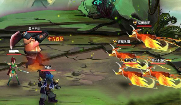 因为凤凰是高攻路线,打架观察他的阵法,可以看到这个BOSS是的站位有点像玩家们的鹤翼。所以个个击破是最好选择,好了,没有纵向攻击,对方攻击又高,我们仍然推荐天门作为阵法选择.